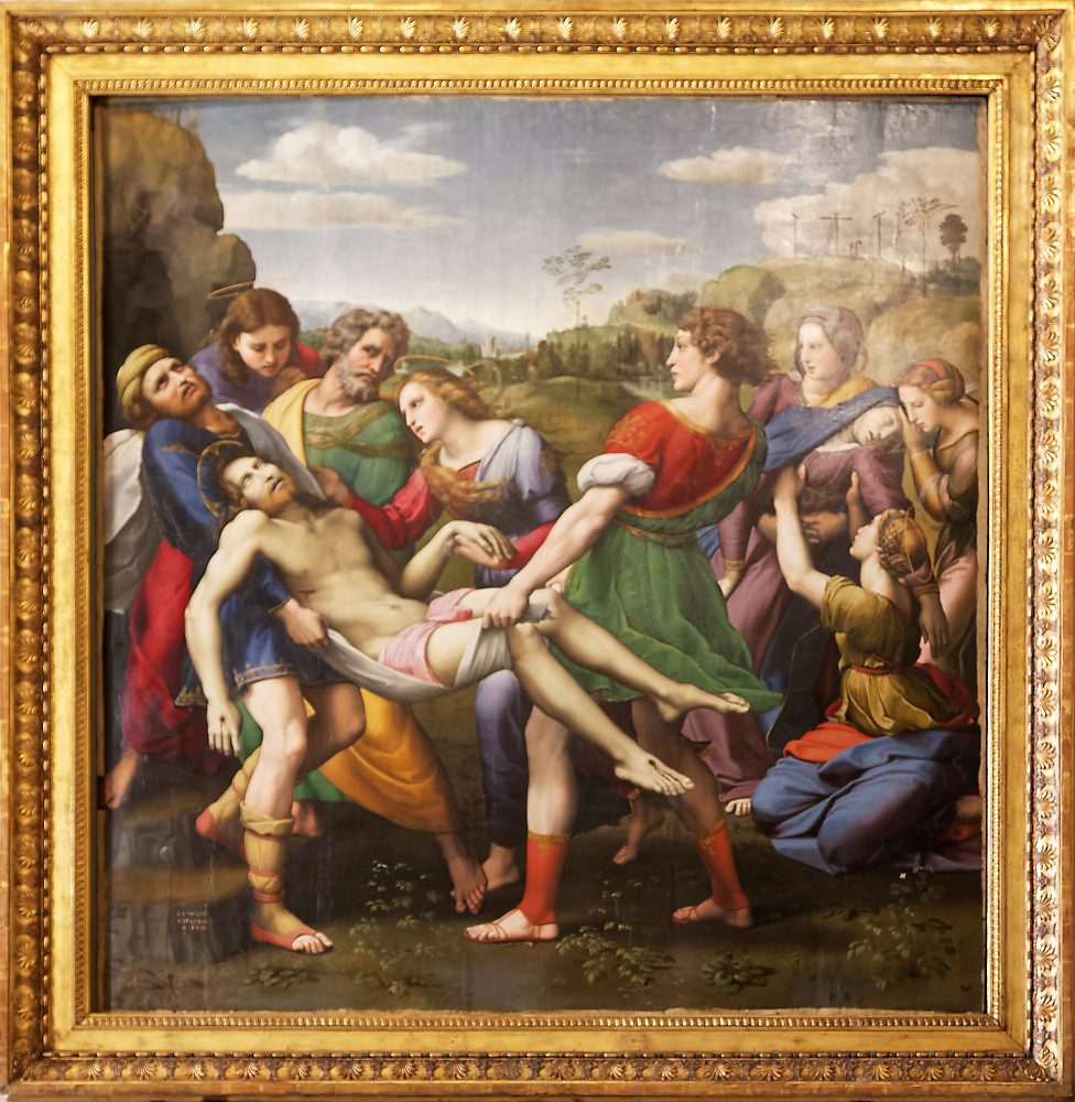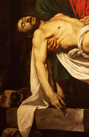 Caravage mêle le thème de la Déploration du Christ avec celui de la Mise au Tombeau. La Déploration montre les proches du Christ pleurant près de son corps au pied de la croix. C’est un épisode en général statique et qui est centré sur l’émotion des personnages. La Mise au Tombeau, elle, implique une action (le Christ est enveloppé dans un linceul puis déposé dans son tombeau) et raconte une « histoire ». Dans ce cas, le peintre montre Saint Jean et Nicodème ( ou Joseph d’Arimathie, comment savoir !) qui portent le corps du Christ et, en même temps, les trois saintes femmes qui le pleurent. Chacune des femmes incarne une manifestation de la douleur : la Vierge écarte les bras vers son fils, Marie-Madeleine, la tête inclinée sur le poing est murée dans son chagrin et Marie-Cléophas, les bras levés au ciel, hurle son désespoir. Il faut noter la possible signification symbolique du verbascum au premier plan. En effet, la tige de cette plante, appelée aussi cierge de Notre-Dame, était enduite de poix et utilisée comme torche au Moyen-Age .Est-ce une allusion à l’Evangile de Jean : « Je suis la lumière du monde. Celui qui vient à ma suite ne marchera pas dans les ténèbres; il aura la lumière qui conduit à la vie (Jean 8-12) » ?