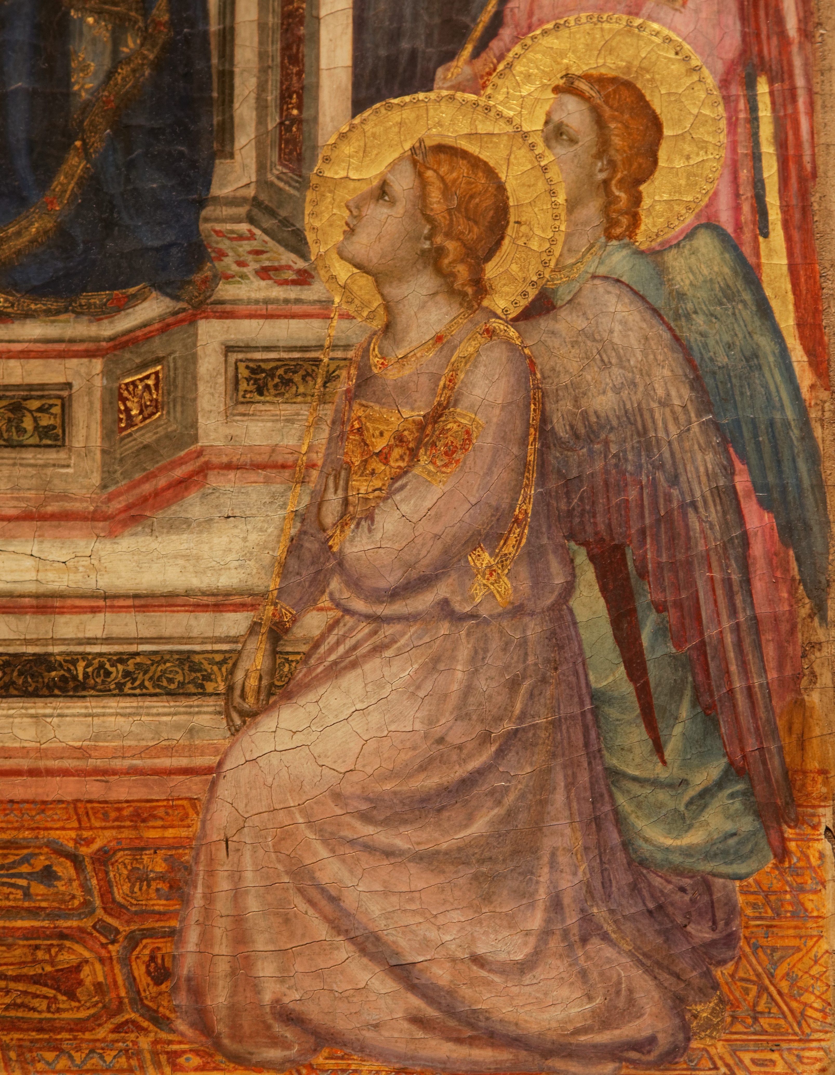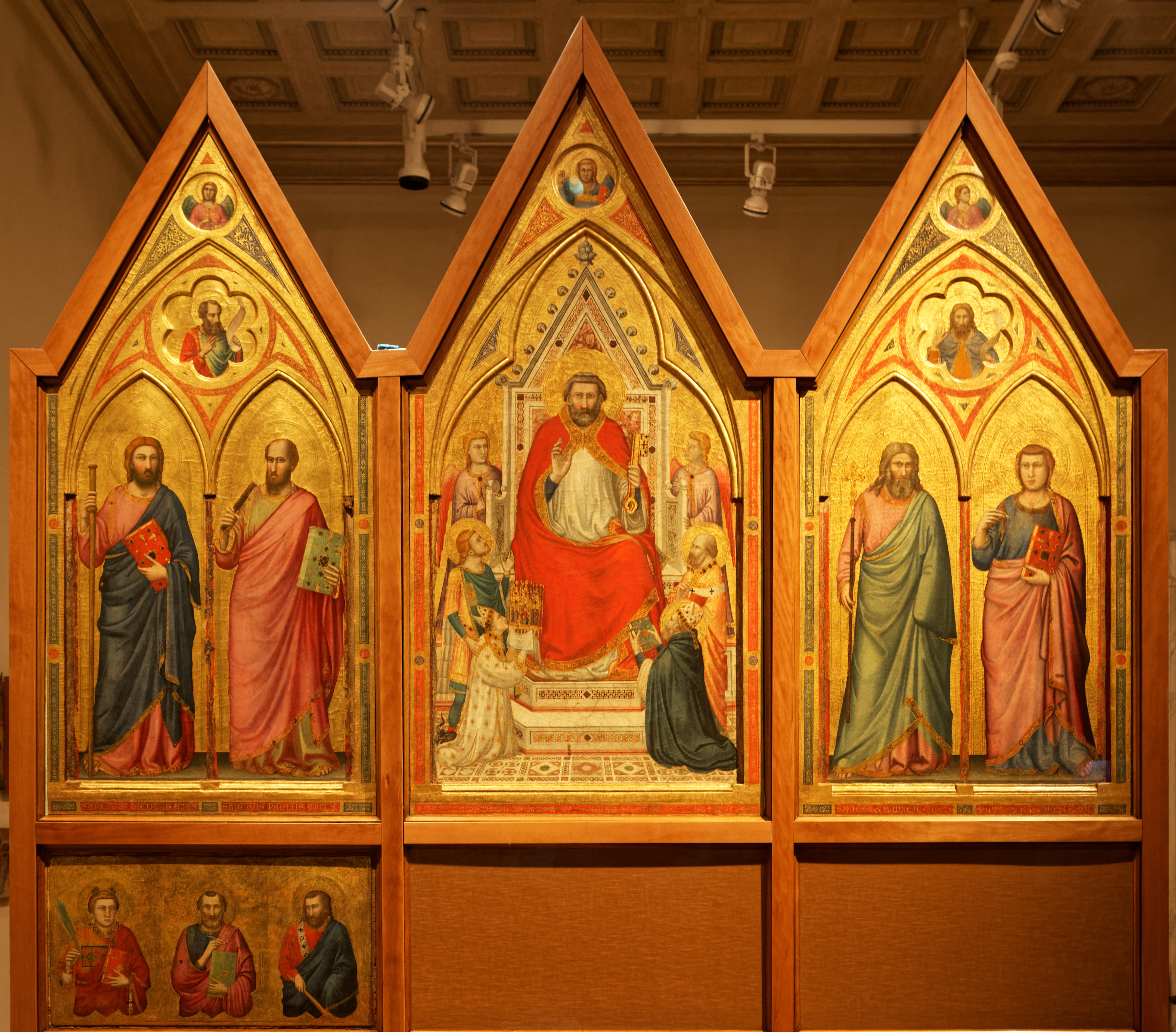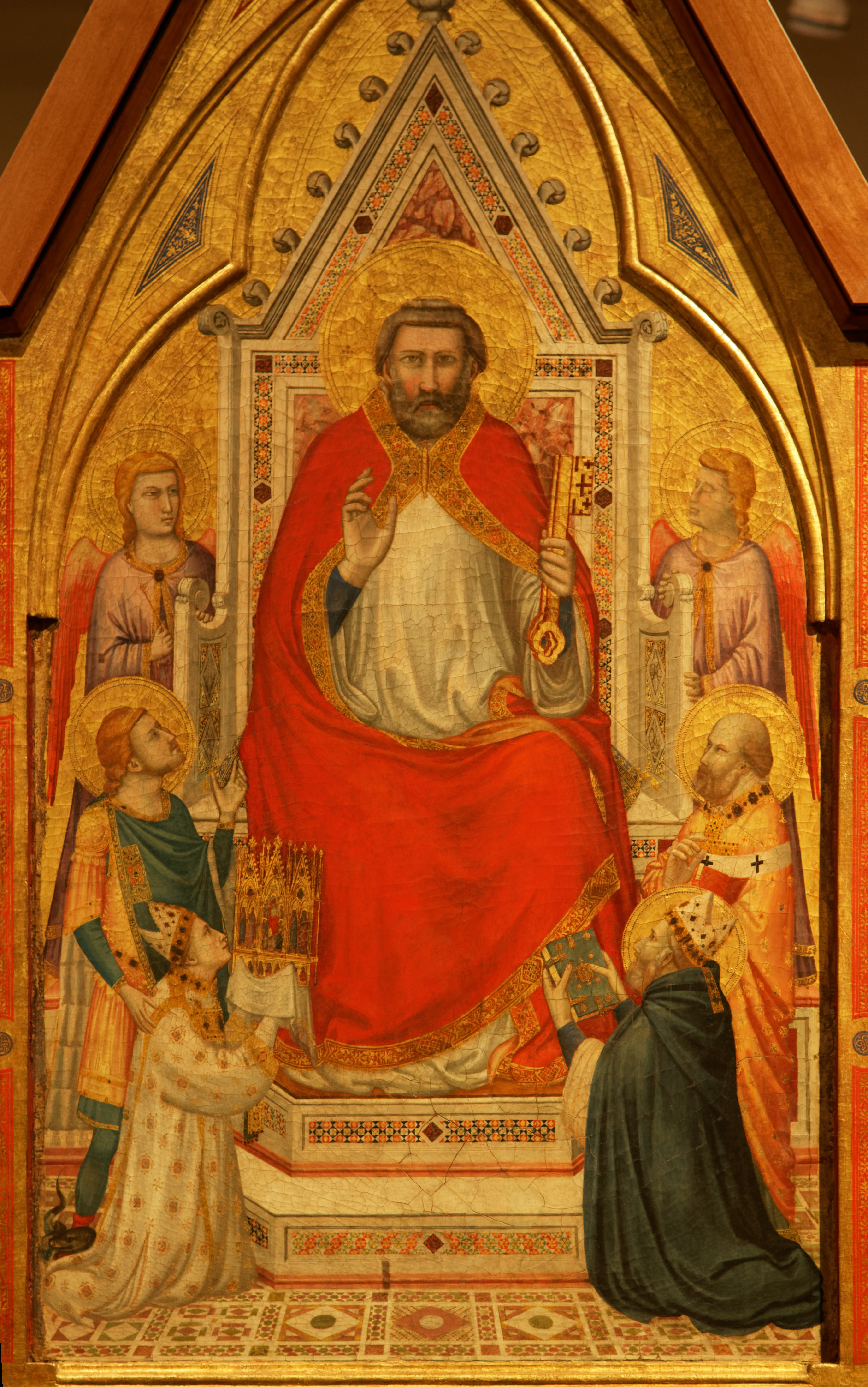 Revenons maintenant au verso du retable. C’est cette fois-ci saint Pierre qui trône sur le panneau central. Il fait le geste de la bénédiction et tient de la main gauche les clés du Paradis. Il est entouré de deux anges ainsi que, une nouvelle fois, de Jacopo Stefaneschi en donateur, présenté par saint Georges (patron de l’église Saint-Georges-au-Vélabre dont le cardinal avait la charge) et offrant à Pierre le retable, en modèle réduit. En face de lui est agenouillé un pape (Célestin 1er ou Célestin V, les avis divergent ! ). On retrouve également le pavement en perspective. Sur les panneaux latéraux, sont alignés les apôtres Jacques, Paul, Jean et André.