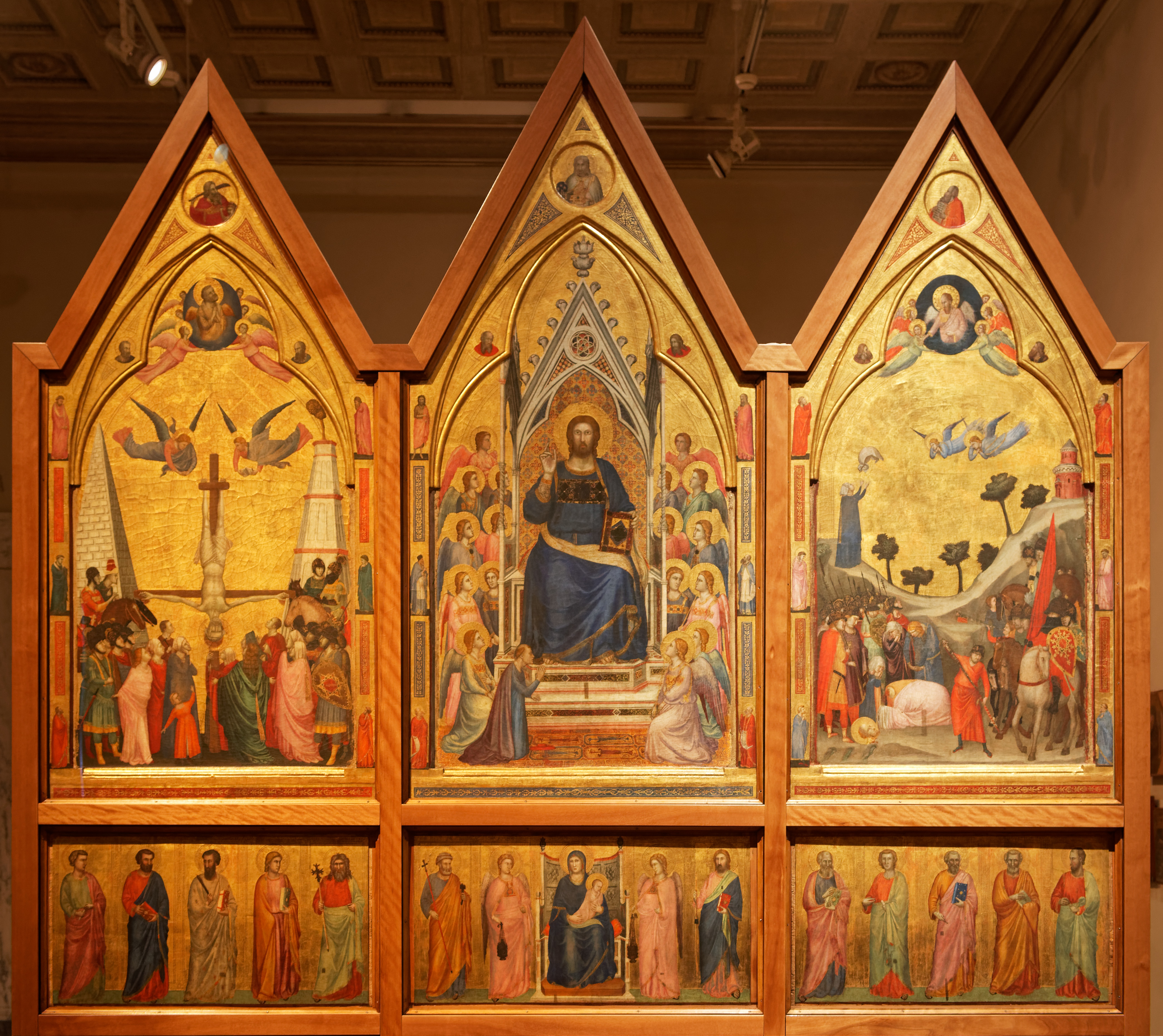 Giotto naît à Colle di Vespignano, petite ville à l’est de Florence en 1267. Nous savons peu de choses de sa jeunesse, hormis qu’il est issu d’une famille paysanne. Sa formation artistique s’effectue à Florence, peut-être dans l’atelier de Cimabue. Dans les années 1290, il exécute un ensemble de fresques relatant la vie de saint François dans la chapelle haute de la basilique d’Assise. Dans ces fresques, il inaugure une toute nouvelle manière de peindre qui s’appuie sur l’observation de la nature et l’expressivité des attitudes et des visages. Cette nouvelle façon de peindre suscite rapidement l’enthousiasme de ses contemporains. De ce fait, le pape Benoît XI décide d’envoyer un des ses émissaires en Toscane pour se renseigner sur le peintre. Le rapport est apparemment si élogieux que Giotto est immédiatement appelé à Rome. On peut facilement imaginer qu’à son arrivée, Giotto a l’occasion de faire la connaissance de hauts dignitaires de l’Eglise, dont le cardinal Jacopo Stefaneschi qui lui commande vers 1320, le retable qui porte son nom et qui sera réalisé par le peintre et son atelier.
