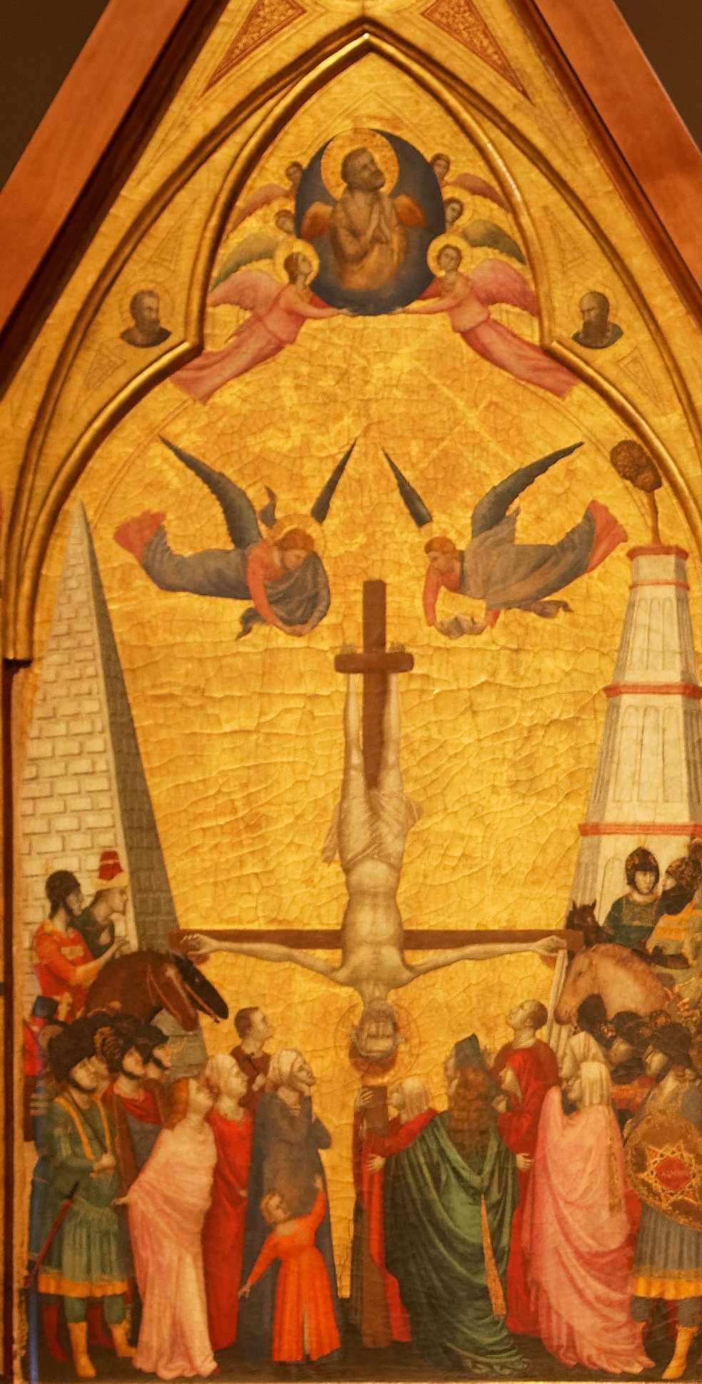 Sur le panneau de gauche, la crucifixion de saint Pierre : malgré l’emploi traditionnel du fond d’or, il y a une grande volonté de réalisme dans la représentation. Saint Pierre est cloué sur la croix, la tête en bas, entouré par les soldats et par la foule qui se presse au pied de la croix. Les attitudes et les expressions des personnages sont très variées. A l’arrière-plan, on peut voir deux monuments de la Rome antique, la meta romuli, une sépulture en forme de pyramide et la pyramide cestia, qui se trouvaient dans le quartier de l’actuel Vatican, lieu présumé du martyr de saint Pierre. En haut, deux anges emportent l’âme du saint dans les cieux.
