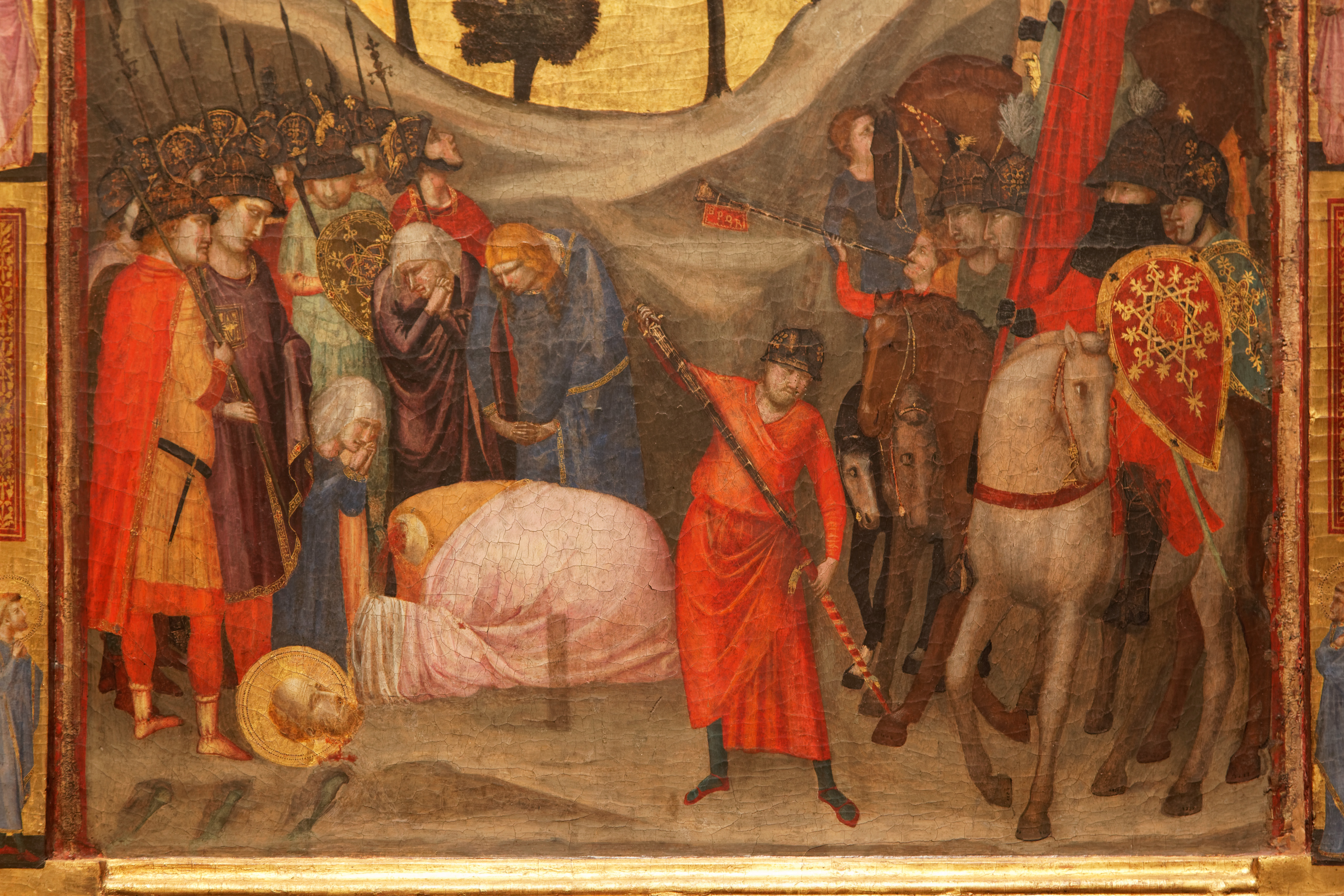 Sur le panneau de droite, la décollation de saint Paul a lieu, là encore, au milieu des soldats et des pleureuses . Nous voyons cette fois un paysage de campagne avec des collines et des arbres. En effet, le martyr de saint Paul aurait eu lieu en dehors de Rome, sur la route qui mène au port d’Ostie, dont on voit le phare sur la colline de droite. Là aussi, l’âme du saint est emporté par deux anges.