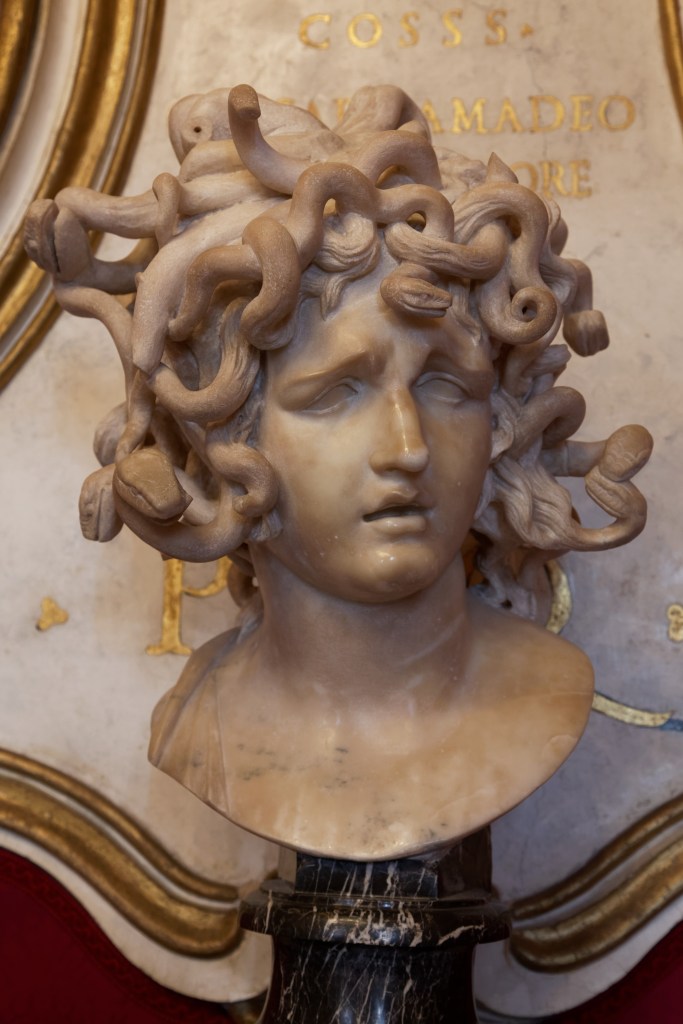 Bernin ne choisit pas de représenter la tête coupée de Méduse tenue par Persée comme c’est régulièrement le cas dans l’histoire de l’art depuis l’Antiquité, en passant par Cellini à la Renaissance et jusqu’à plus récemment Christophe Charbonnel.