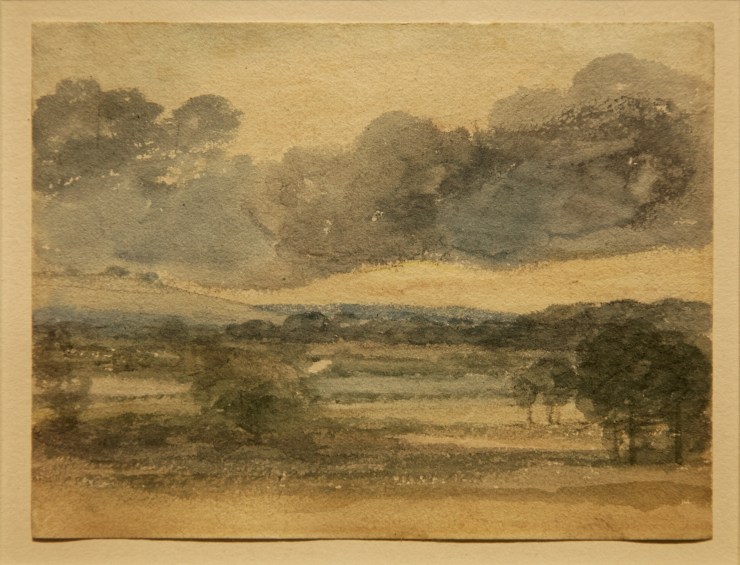 The landscape is reduced to a few bands of colours that reflect the immobility of the countryside. The cloudy sky reflects Constable’s interest in atmospheric disturbances, a taste that would intensify around 1820