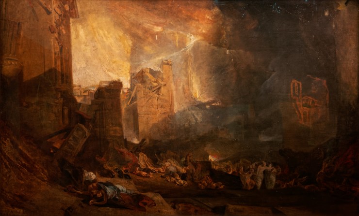 Turner shows the chaos of the biblical episode. There is a pile of ruins and bodies, in which Lot and his daughters can hardly be distinguished, fleeing to the lower right.