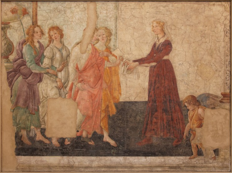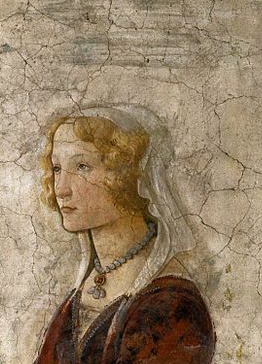 Domenico Bigordi, dit Ghirlandaio est né en 1449 à Florence, où il restera et travaillera toute sa vie. Il débute dans l’atelier de son père, qui est orfèvre et il développe rapidement une grande habileté pour la peinture et notamment l’art du portrait. Tout au long de sa carrière, il exécute de nombreuses fresques qui sont souvent l’occasion de portraiturer la bonne société florentine. C’est ainsi qu’en 1486, Giovanni Tornabuoni lui commande un cycle de fresques pour sa chapelle familiale en l’église Santa Maria Novella. Giovanni est un homme important, trésorier du pape et directeur, à Rome, de la filiale de la banque Médicis, famille dont il est très proche puisqu’il est l’oncle de Laurent de Médicis. En cette même année, le 15 juin 1486, son fils Lorenzo épouse Giovanna degli Albizzi. Elle a 18 ans et est issue, elle aussi, de la haute bourgeoisie florentine. A l’occasion de leur mariage, la famille Tornabuoni commande une médaille de mariage au sculteur Niccolo Fiorentino et fait réaliser, par Boticelli, deux fresques destinées à décorer la loggia de leur villa et qui sont dédiées, l’une à Lorenzo, l’autre à Giovanna.