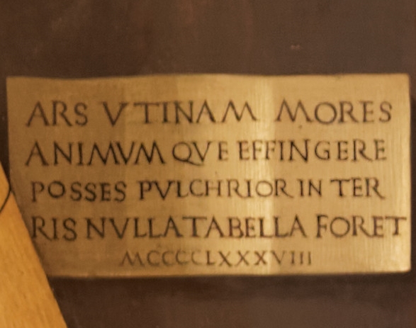Derrière elle, on voit, à gauche le bijou et, à droite, un collier de corail, un livre de prières et un cartel avec une inscription. A l’époque, le corail jouait le rôle d’un talisman et on le portait pour éloigner les mauvais esprits. Ici, il souligne la pureté de l’âme de la jeune femme, préservée de tout mal. Sur le cartel, il est écrit : » Ars utinam mores animunque effigere posses pulchrior in terris nulla tabella foret » ( Art, si tu était capable de peindre l’esprit et les mœurs, il n’existerait sur terre de tableau plus beau). Il s’agit d’une variante d’une épigramme du poète latin Martial, alors très en vogue dans la société cultivée florentine. Il met en valeur les qualités intellectuelles et morales du modèle.