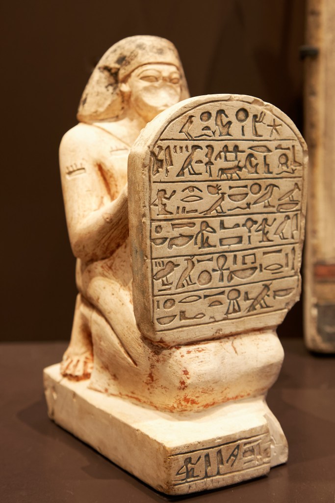 This statue represents the deceased kneeling with hands raised in a gesture of adoration. He is holding on his knees a stele with the text of his prayer for the gods to help him make the journey to the world of the dead. It was to be placed in the tomb chapel.