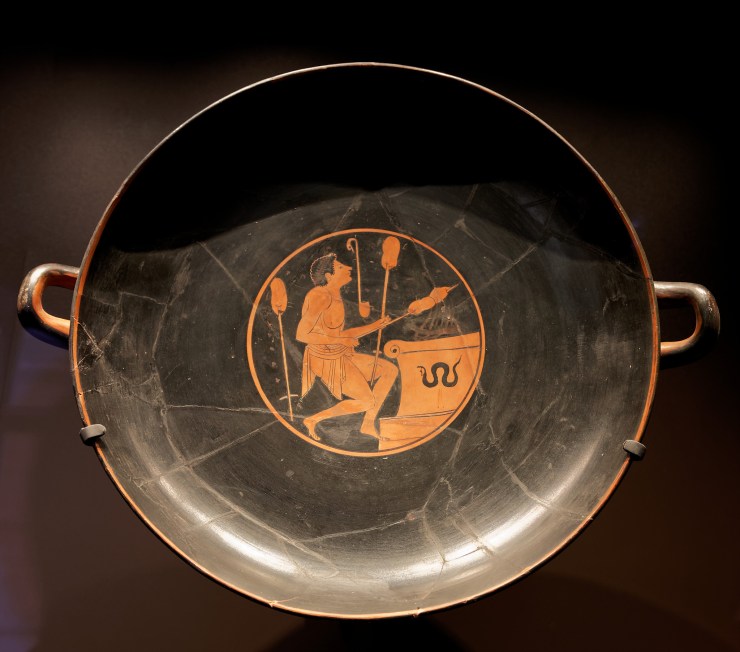 A hydria is a vase used to collect and transport water. It is a ceramic with black figures on a red background. It represents on its belly an episode from mythology: The tripod dispute between Hercules and Apollo. Hercules (here visible with his club and dressed in lion skin) wanting to have his own oracle, had stolen from Apollo the tripod used in Delphi to return the oracles. It will take the intervention of Zeus to separate them and return the tripod to Apollo.