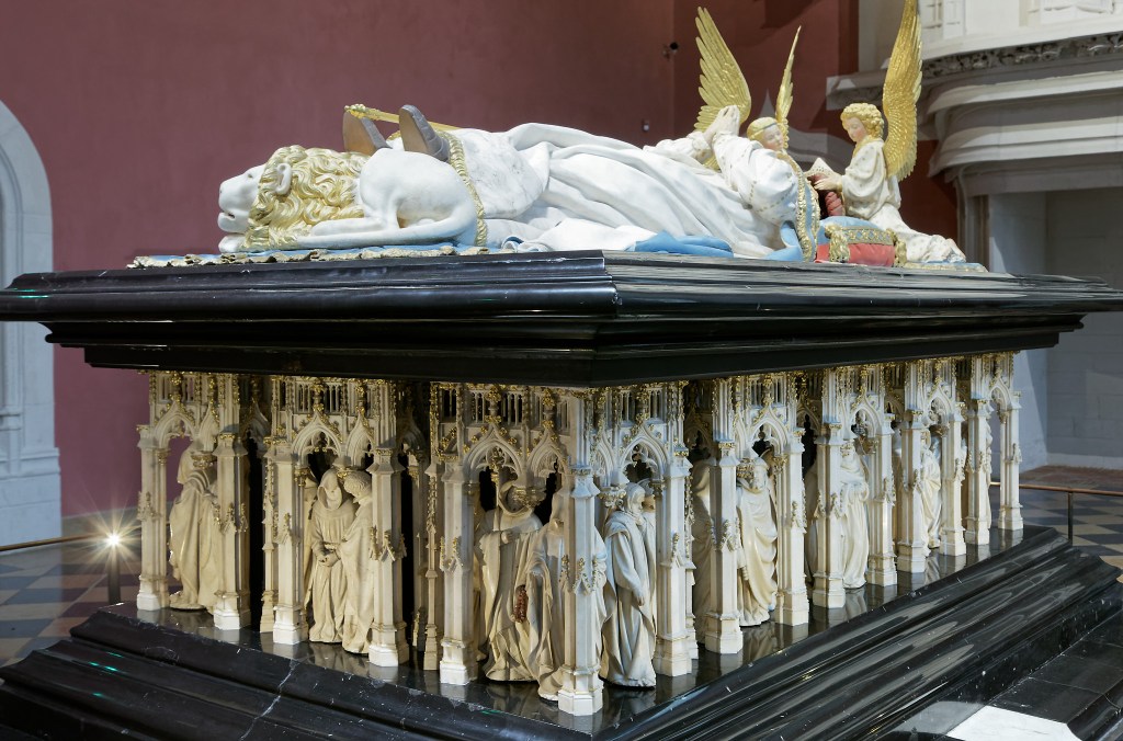 Philippe le Hardi souhaitait également que son tombeau prenne place dans le chœur de l’église la chartreuse de Champmol. De ce fait, il commande, en 1381, le monument au sculpteur Jean de Marville. C’est lui qui conçoit le tombeau avec sa dalle de marbre noir recevant le gisant du duc et son soubassement en albâtre abritant une procession de pleurants sous une architecture gothique.