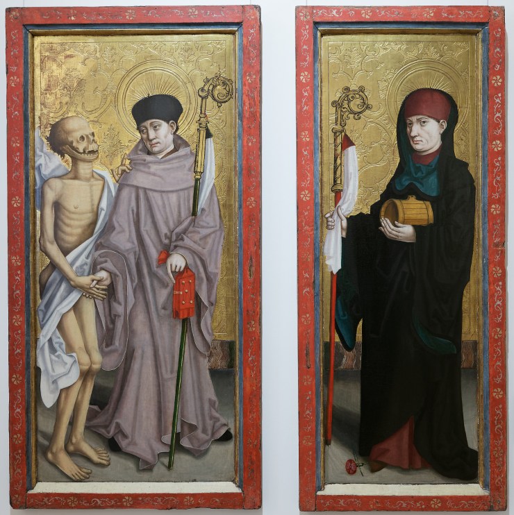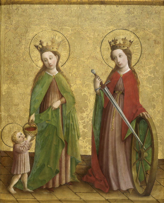 This panel is a fragment of the Altarpiece of Saint Baindt which was in the convent of the Cistercian nuns of Baindt, near Ravensburg. The saints are depicted standing on a tile floor in perspective before a gold background worked with a punch, imitating a brocade. The painter still retains the sinuous lines and bright colours of the International Gothic, while trying to bring something new to the treatment of the tiles.