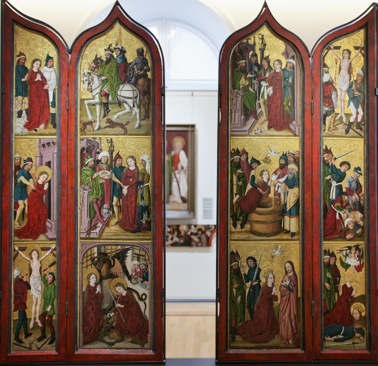 The altarpiece is said to come from the former church of the Madeleine convent in Strasbourg. It tells the story of Marguerite’s martyrdom: her arrest, her flogging, the attack of the dragon, her immolation, her bath in ice-cold water and, finally (!), her beheading.