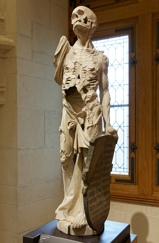 Burgundian artists are also present in the field of sculpture, as can be seen in the transi from Cîteaux Abbey. It is representative of a realist current in the representation of death which was expressed during this period marked by epidemics and conflicts. These representations of corpses were spread both on tombs and in cemeteries. Here, the emaciated skeleton was certainly brandishing the arrow that threatens us all with death and holding, in the other hand, a shield with an inscription inviting us to reflect on our inescapable destiny. This sculpture can be related to another, very similar, sculpture that decorated the cemetery of the Innocents in Paris.