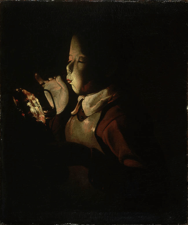 The reign of Louis XIII saw a multiplication of provincial workshops, notably in Nancy, residence of the Dukes of Lorraine and a flourishing town, which encouraged the development of talented artists, including Georges de La Tour. The subject of the « Souffleur à la lampe » (Blower at the Lamp) was quite common at the time. It favoured striking chiaroscuro effects. Emerging from the darkness, the child’s face is lit only by the glow of a firebrand. This luminous effect accentuates the deformation of the face and the geometry of the volumes.