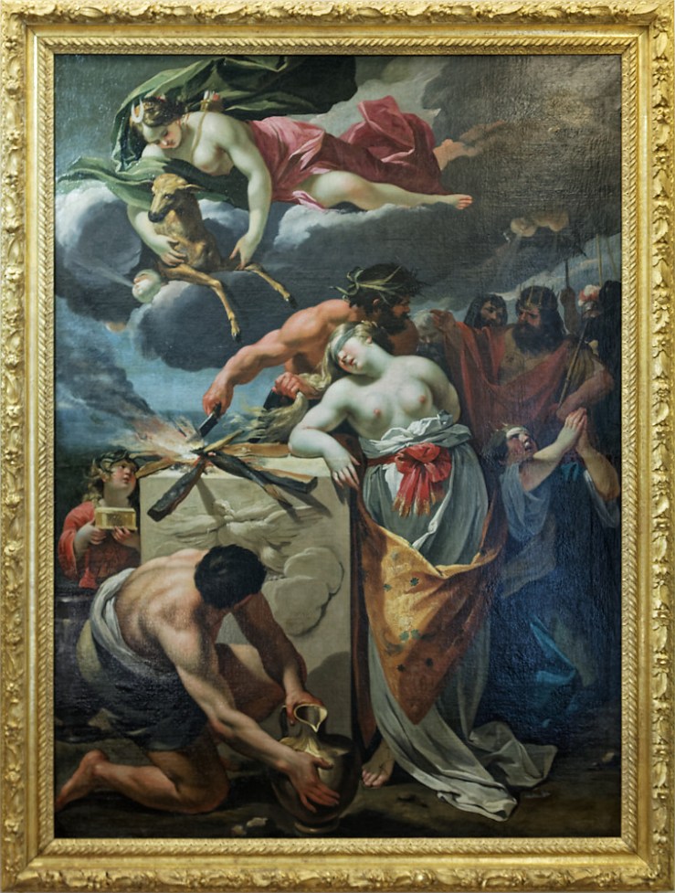 For his part, the Burgundian François Perrier develops an original style with brilliant chromaticism, while looking towards the baroque with slightly theatrical stagings. « Le sacrifice d’Iphigénie » was intended to adorn the top of a fireplace. The theme of Iphigenia’s sacrifice was widespread for this type of decoration because the fire lit and the smoke reflected the reality of the chimney fire.