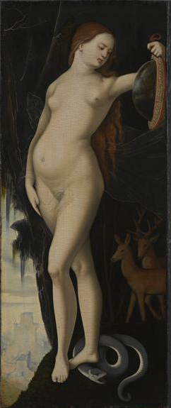 The central panel of a small polyptych evoking Earthly Vanity and Heavenly Redemption, this young girl with a mirror symbolises both vanity and lust.
