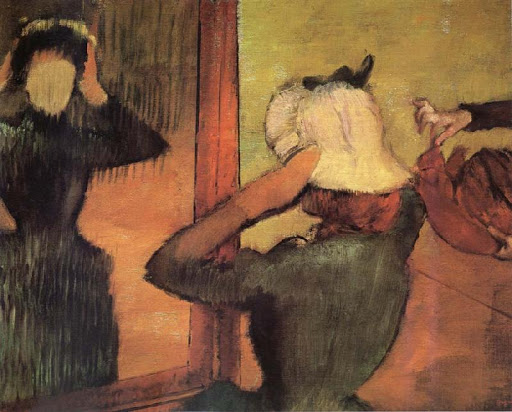 Normally the presence of the mirror allows the model to be seen from two different angles, but Degas decides to give only an allusive image of the face. It is up to the spectator to project an image.