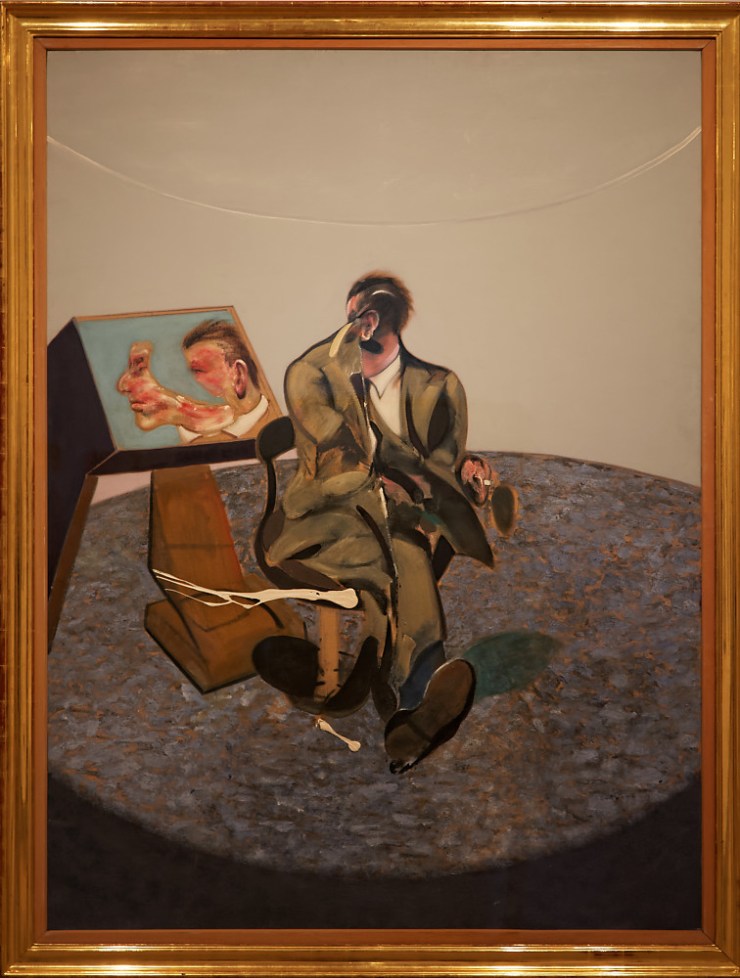 Here the face reflected in the mirror, even if it is split in two, is more realistic than the portrait of the model to which the painter applies distortions. If we join the two reflected halves together, we obtain a rather naturalistic portrait of Georges Dyer. What interests Bacon is not appearances but what is hidden inside his models. The halved reflection perhaps evokes the double nature of Dyer’s character.