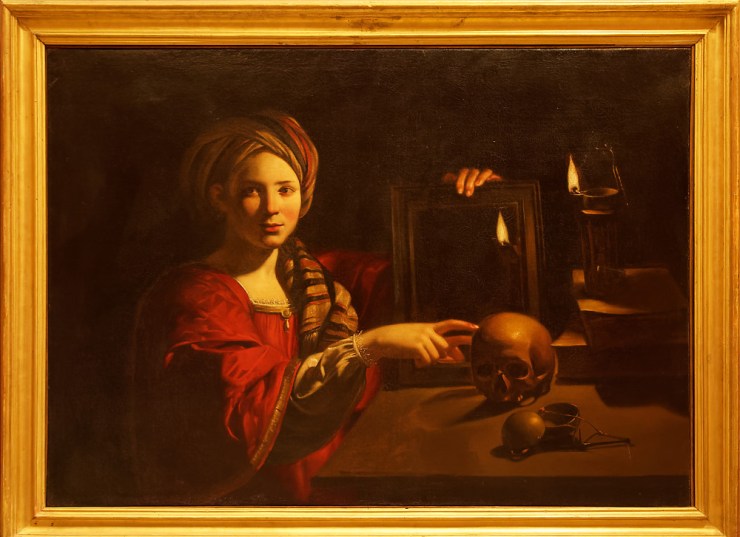 Accompanying the mirror are the other symbols of Vanity, the skull and the candle. This type of subject is very close to the « Repentant Madeleines » where we often find the symbols of Vanity.