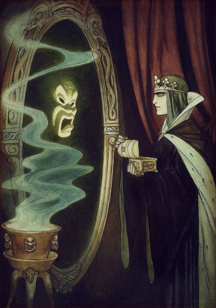 Tales have taken hold of the image of the magic mirror, as evidenced by the Swedish illustrator Tengrenn in this drawing which served as a preparatory study for Walt Disney’s famous cartoon.