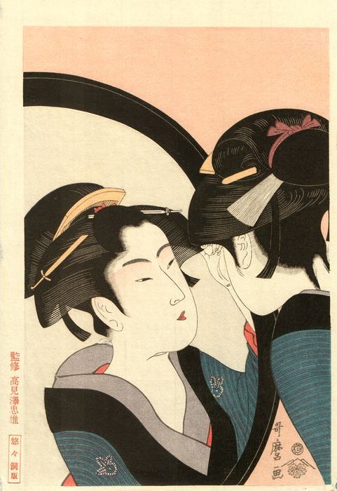 Both models, as they age, see the reflections of their faces transformed into skulls. This also constitutes a Vanity, i.e. an allegory of the passage of time, death and the futility of human activities.