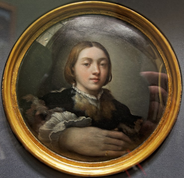 At the age of 21, Parmigianino demonstrates all his technical virtuosity by depicting himself in a room deformed by the use of a convex mirror.