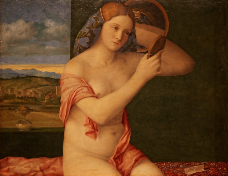 To end our tour in beauty, the mirror can be found in many representations of women at their toilette. This is because it has great erotic power: it can be seen from many angles and enhances a woman’s body and adornment. Here again, a large number of works over the centuries bear witness to this: