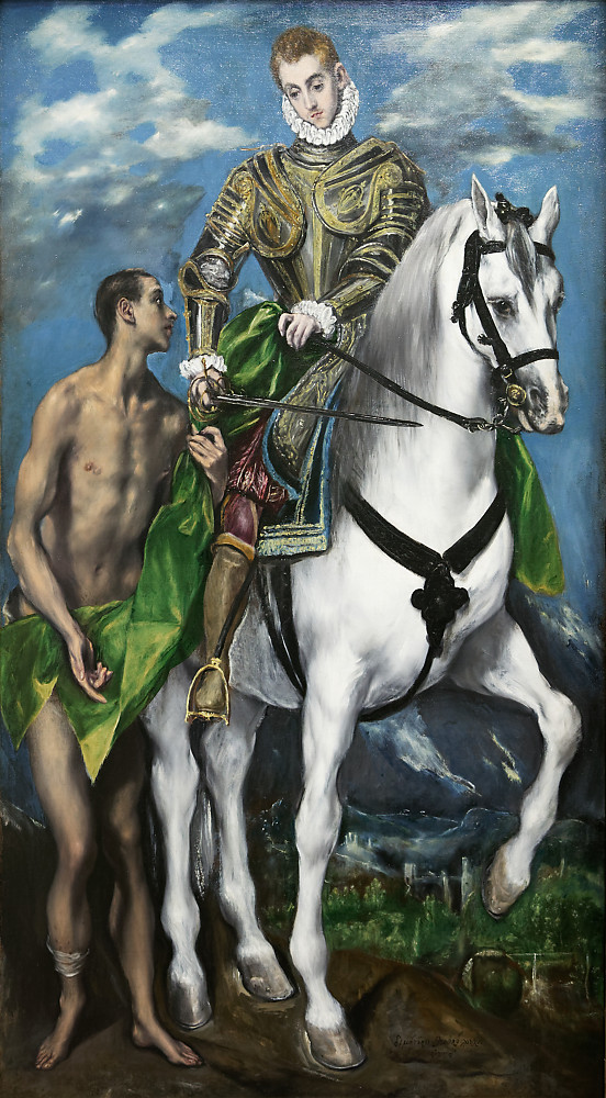 Greco, lui, ne s’intéresse pas à la réalité de la scène. En dehors de l’armure du chevalier, il n’y pas grand-chose de réaliste dans le tableau. Il n’y a pas de perspective convaincante. La scène se déroule dans un espace irréel. Les couleurs paraissent surnaturelles tout comme la lumière, dont on ne voit pas la source. Le corps nu et très allongé du mendiant n’a rien de réaliste. Et s’il existe bien une vue de Tolède au second plan, le moins que l’on puisse dire est qu’elle reste allusive et n’a rien d’un relevé topographique. Le Greco, c’est le contraire de l’anecdote, de l’histoire à raconter. Ce qu’il montre, c’est un idéal. Ce qu’il recherche, c’est suggérer l’annonciation d’une apparition et d’une conversion, c’est rendre la grandeur d’âme de Martin et la grâce divine qui descend sur lui.