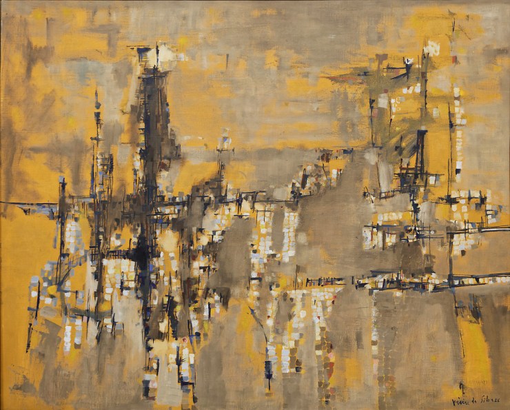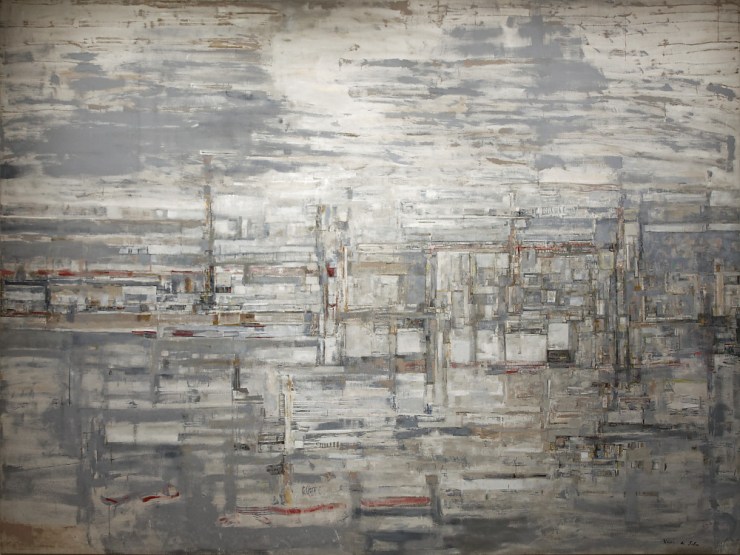 This huge painting is a rare format for the artist. This urban landscape, between figuration and abstraction, is typical of his work.