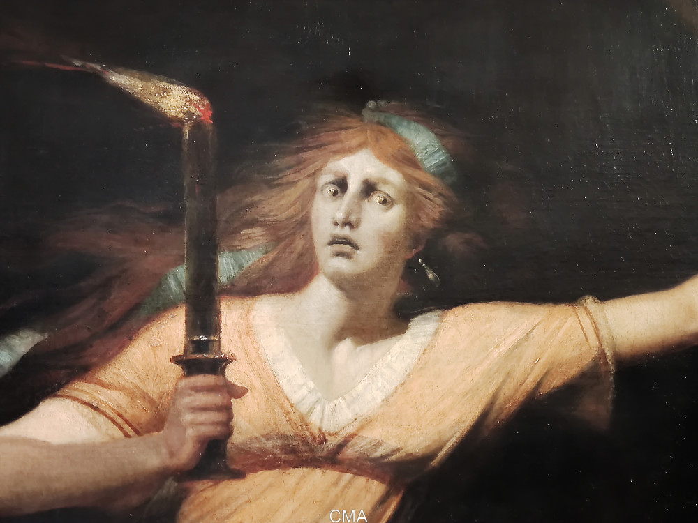 In the second half of the 18th century, Macbeth became one of Shakespeare’s most popular and widely performed plays. This episode is taken from Act V, in which Lady Macbeth, after convincing her husband to murder the king and haunted by remorse, has a sleepwalking attack, in front of her physician and her maid. It is a monumental figure that occupies almost the entire height of the canvas. The violent lighting is inspired by theatrical lighting and emphasizes the face of the character, with its exorbitant eyes. The large arm gesture also accentuates the dramatic effect.