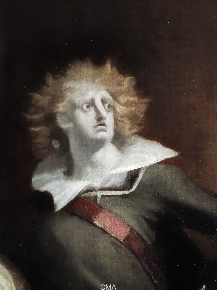 In order to render Hamlet’s emotion in front of his father’s ghost, Füssli plunges us into an imprecise, sober setting, with little indication of the space occupied by the characters. The atmosphere is bathed in a nebulous light. The artist plays on the contrast between the forms: the stiff position of the ghost facing an unbalanced Hamlet, with a raised foot. The figure of Hamlet is built on intersecting diagonals, which accentuates his unstable position. The frightened face, with its hair standing up, is inspired by a famous contemporary actor, David Garrick. He was known for his very expressive performances. It is known that he had a mechanism that allowed him to make the hair on his wig stand up.