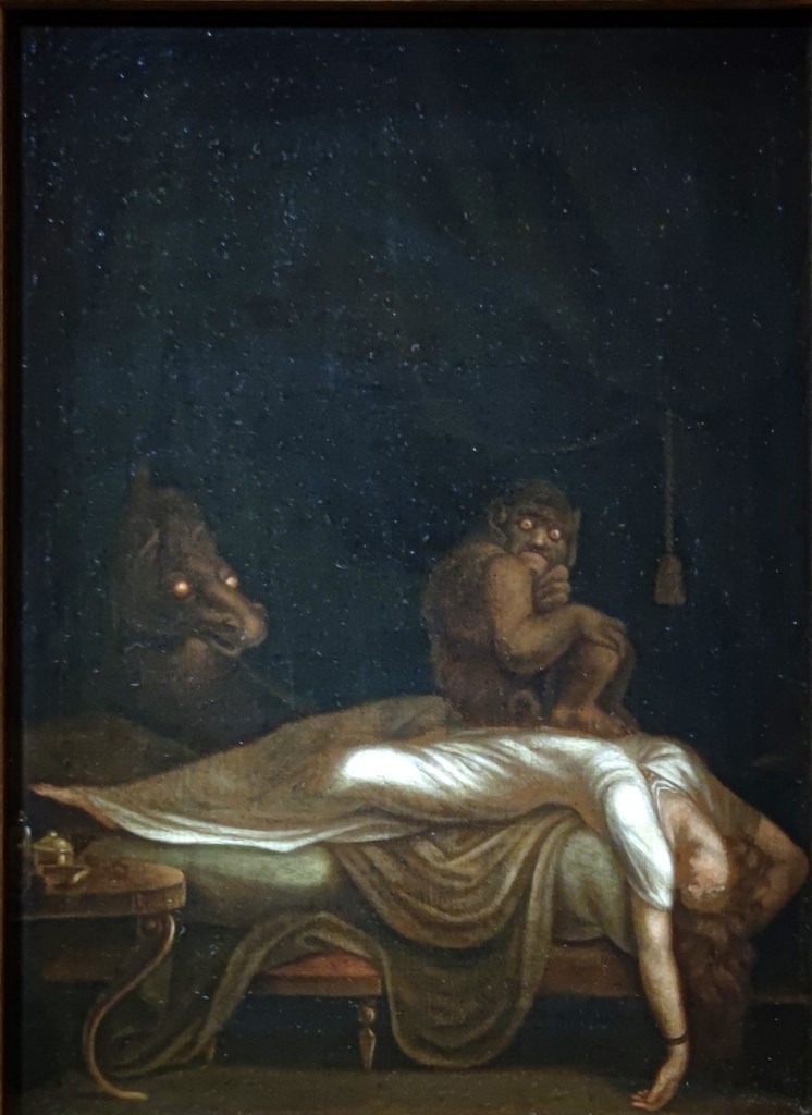 This copy is one of the multiple versions that followed the « Nightmare » presented in 1781, which caused a scandal while ensuring the fame of the painter. The meaning of the painting is still unclear. A young woman is asleep and an incubus is sitting on her stomach. Is it her dream, her nightmare, her fantasy, that of the viewer? The nightmare hypothesis is favored because of the horse’s head, which is a play on words in English: nightmare and night mare. There is undeniably an erotic component: the incubus ( demon who sexually abuses women) which contrasts with the white dress, symbol of purity, or the position of the sleeper, closer to an orgasm than a quiet night…