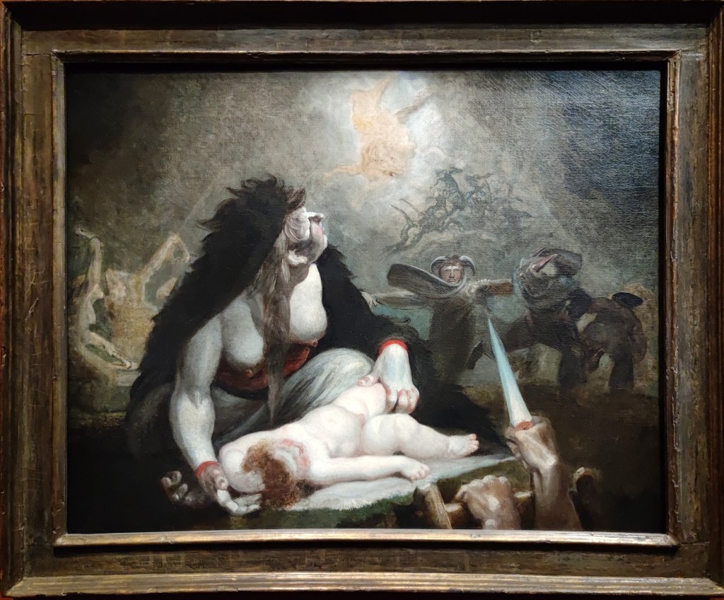 With this work illustrating a passage from Milton’s Paradise Lost, the painter plunges us into the disturbing world of witchcraft and horror. The witch of the night comes to interrupt a witch who is about to sacrifice a baby.