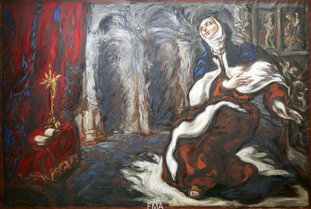Dans cette œuvre commandée pour fêter le quatrième centenaire de la mort de la sainte, le peintre montre qu’il est toujours possible, grâce à la peinture, de retranscrire l’extase, ce phénomène à mi-chemin entre la douleur et la jouissance.