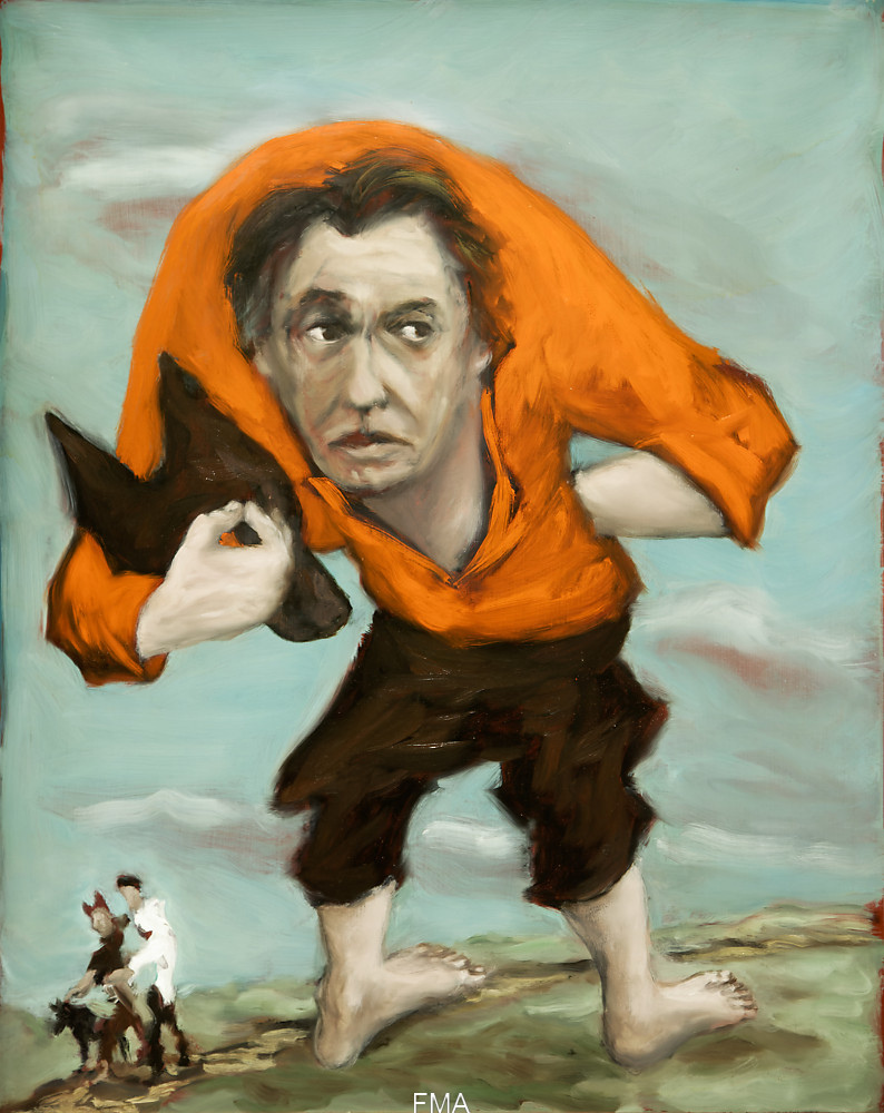 Garouste a réalisé plusieurs autoportraits. Ici, il se représente dans un paysage avec un masque de chien, qu’il porte sous le bras. Le chien, guidé par son flair, renvoie à l’intuition. Les pieds du peintre, orientés vers l’arrière, soulignent le refus d’emprunter une voie unique et invitent à l’errance.