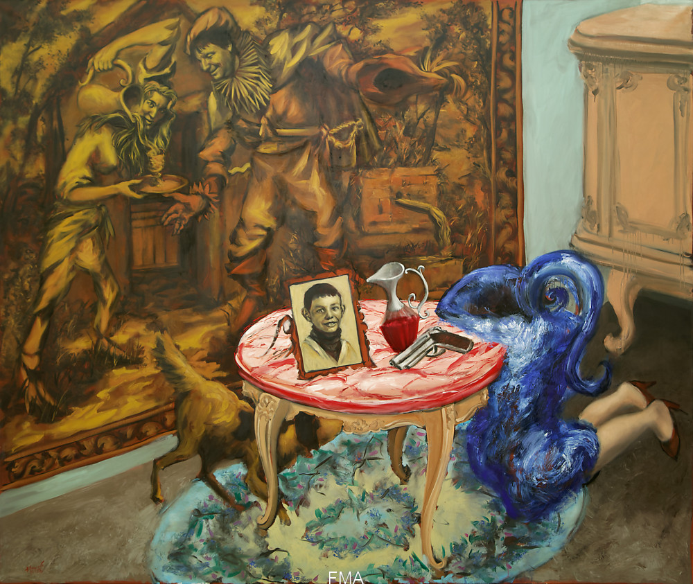 Ce tableau renvoie à la violence de son père, psychopathe capable de menacer sa femme en posant un pistolet sur la table parce qu’elle tenait l’aiguière par le goulot et pas par l’anse.