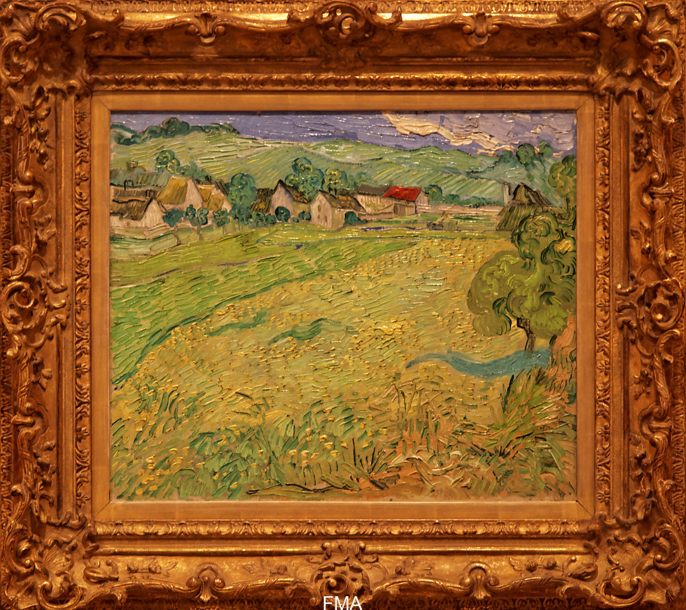 Vincent peint ici un lieu-dit, dans les environs d’Auvers. Derrière un immense champ de blé qui envahit plus de la moitié de la toile, on voit un ensemble de maisons, des collines puis une étroite bande de ciel. Les touches sont précises et très empâtées. Elles forment des lignes courtes ou longues, des points, des ondulations, comme les traits d’un dessin. L’artiste dessine avec la couleur. Ses couleurs s’éloignent de plus en plus de la réalité. L’ombre de l’arbre, à droite, devient une forme ondulante bleu turquoise. Van Gogh croit aux vertus fortifiantes de la campagne et il essaie de rendre ce sentiment à travers sa peinture.
