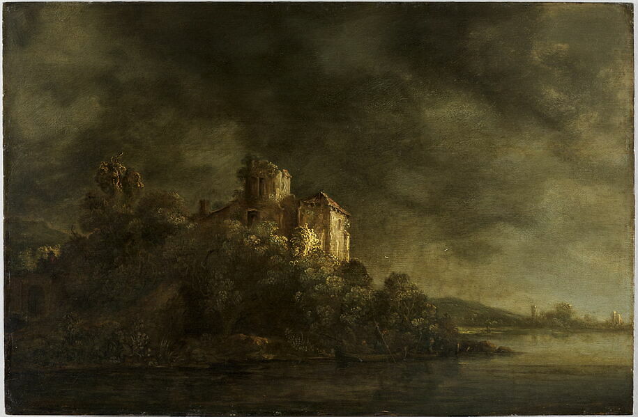 Il y a un souci de réalisme dans la représentation du clocher en ruine et du petit cimetière qui l’entoure. C’est un paysage à l’atmosphère lourde et triste. Cette atmosphère aux couleurs sombres évoque les paysages de Rembrandt.
