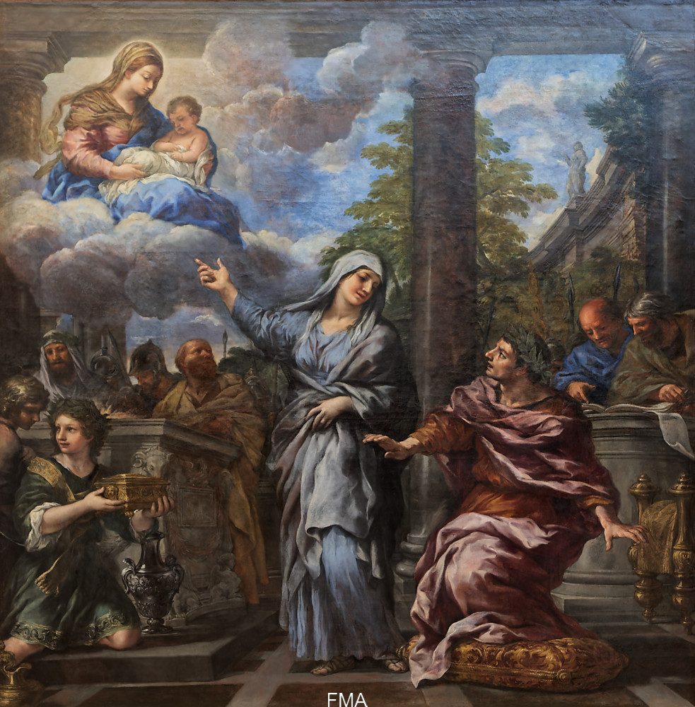 I like the composition built on a long diagonal from Augustus to the Virgin.